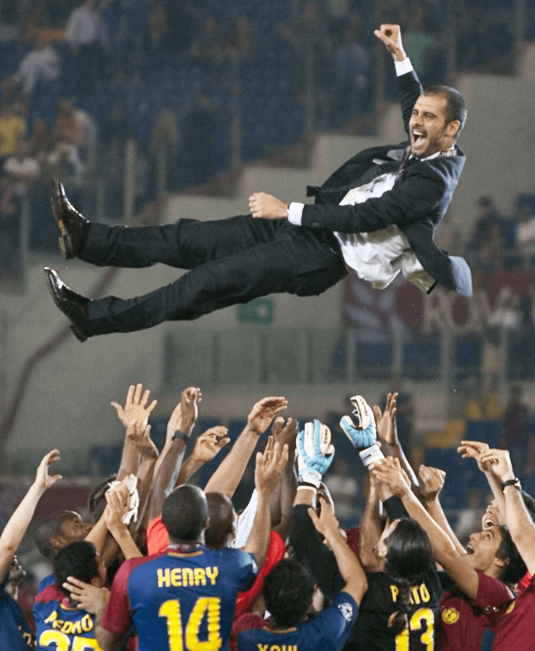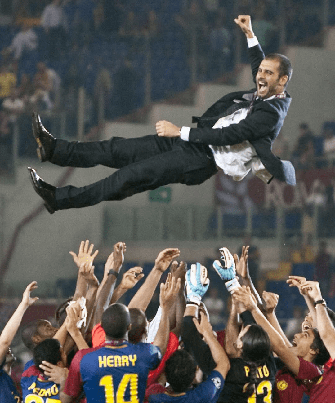 Enmig de l’eufòria, els jugadors alcen el seu tècnic. Pep Guardiola és enlairat pels mateixos homes que han interpretat el seu somni al camp. En aquell instant, no hi ha tàctiques ni paraules, només emoció pura. Un gest espontani que ho diu tot: confiança, gratitud i comunió absoluta entre entrenador i equip.