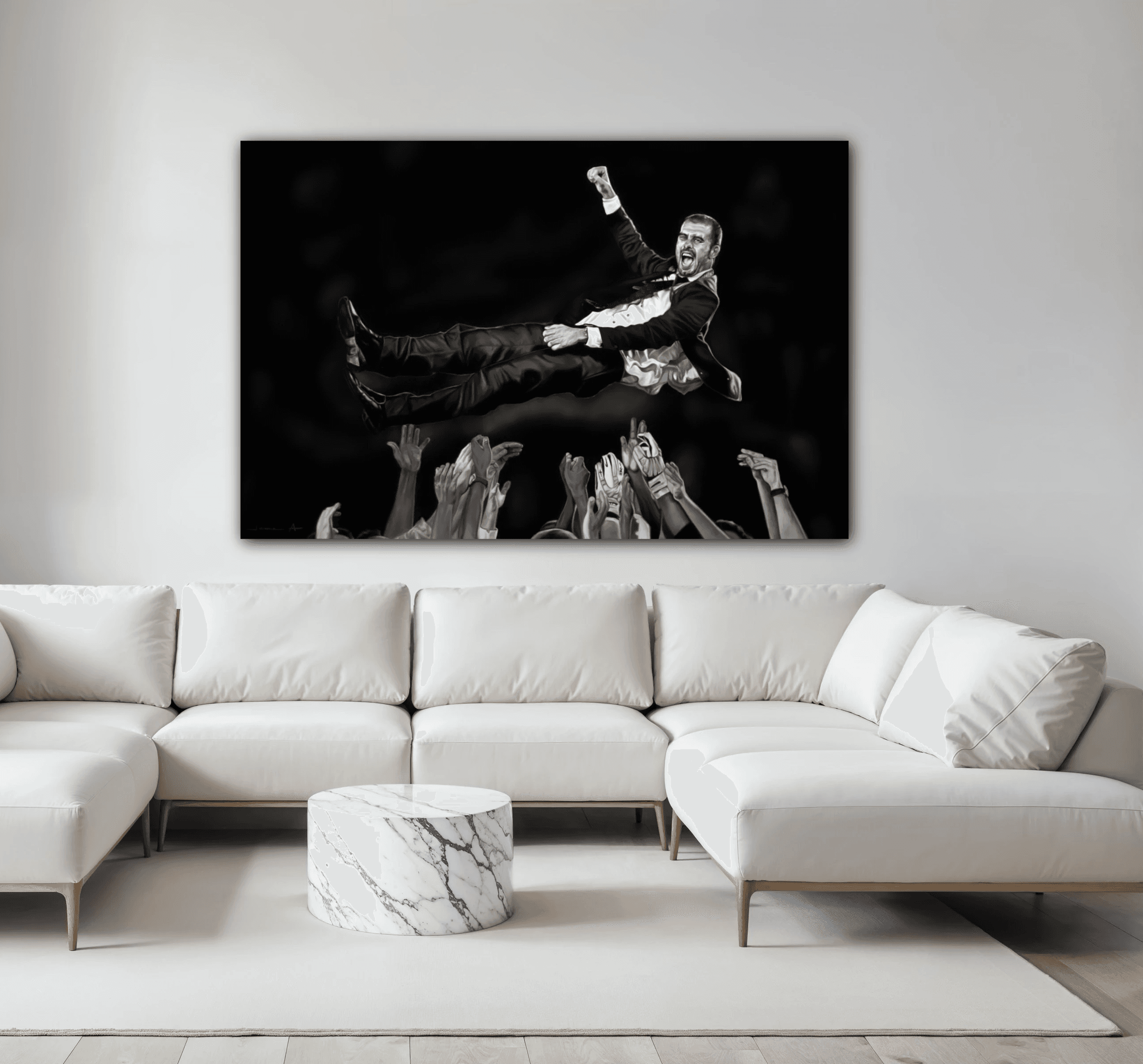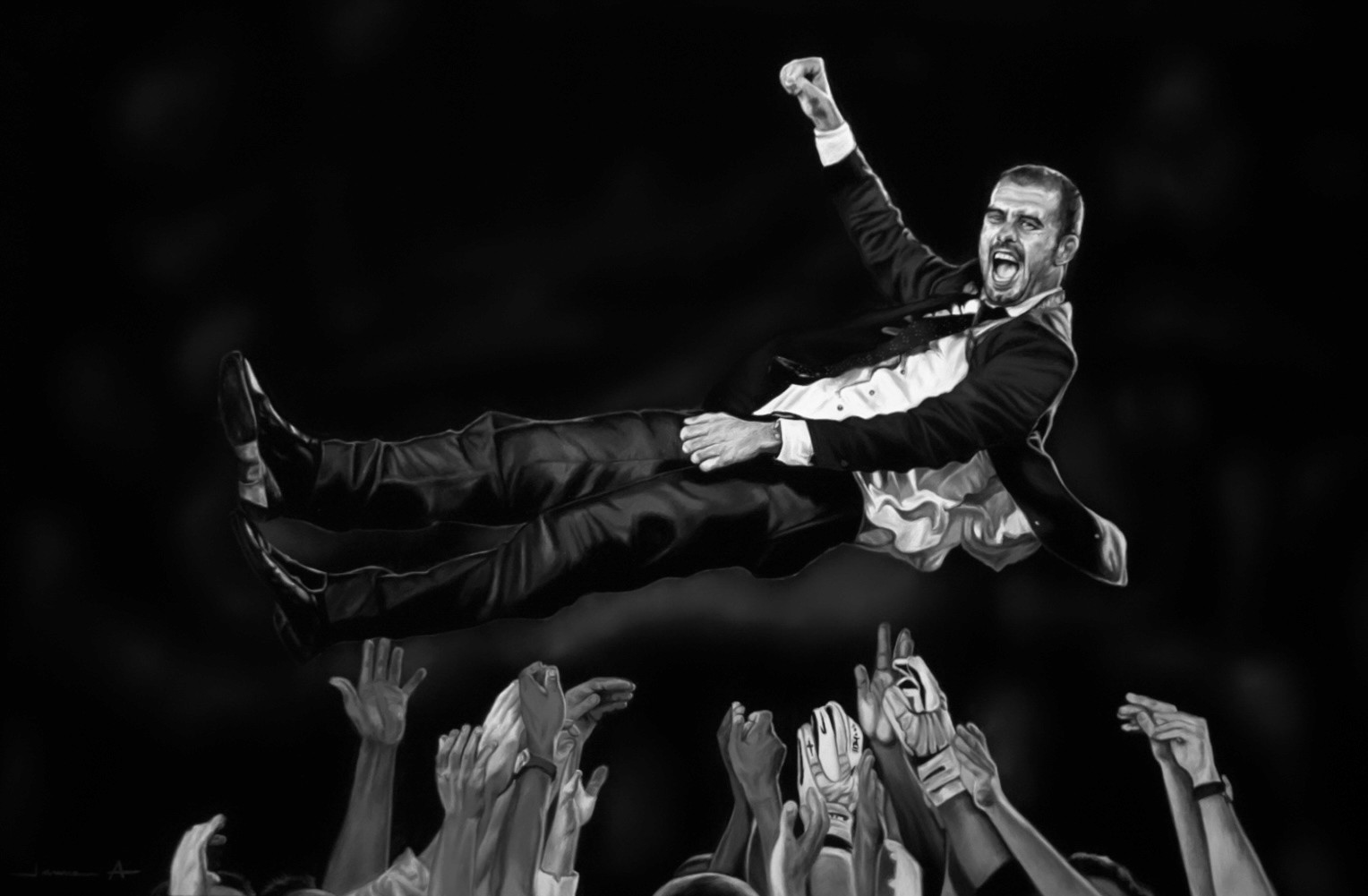 Aquesta obra captura l’instant exacte en què el temps s’atura. Quan la glòria pesa menys que l’aire i un equip s’aixeca per sobre de la història. Un any màgic per al Barça. Un any etern per a Guardiola.